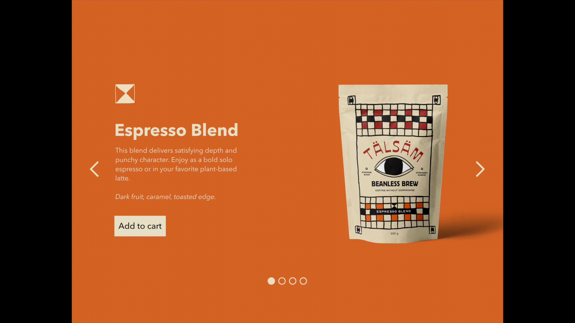 Website design featuring brand storytelling and an online store showcasing a variety of Tälsäm Beanless Brew products.